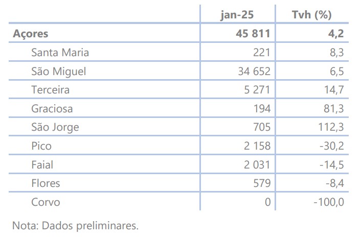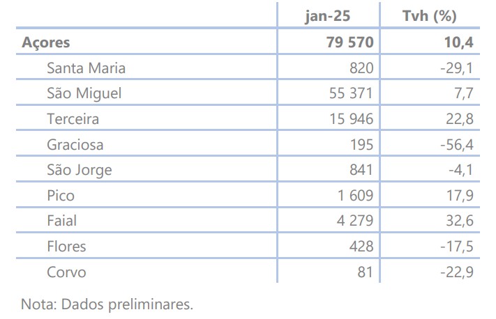 No alojamento local, em janeiro, as ilhas que apresentaram variação homóloga positiva nas dormidas foram: São Jorge (112,3%), Graciosa (81,3%), Terceira (14,7%), Santa Maria (8,3%) e São Miguel (6,5%). Em sentido inverso, as ilhas Corvo (-100,0%), Pico (-30,2%), Faial (-14,5%) e Flores (-8,4%).