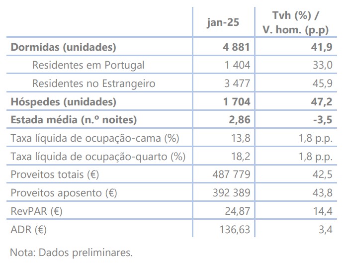 Os proveitos totais, no mês de janeiro, registaram uma variação homóloga positiva de 12,2%, atingindo 4,8 milhões de euros, e os proveitos de aposento tiveram uma variação positiva de 11,1% relativamente ao mesmo mês do ano anterior, totalizando 3,1 milhões de euros. O rendimento médio por quarto disponível (RevPAR) foi de 18,86 euros e por quarto utilizado (ADR) foi de 66,46 euros.