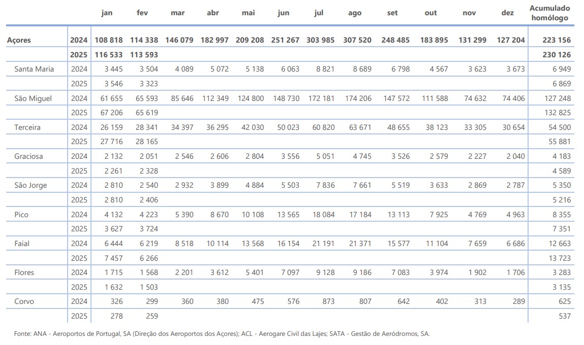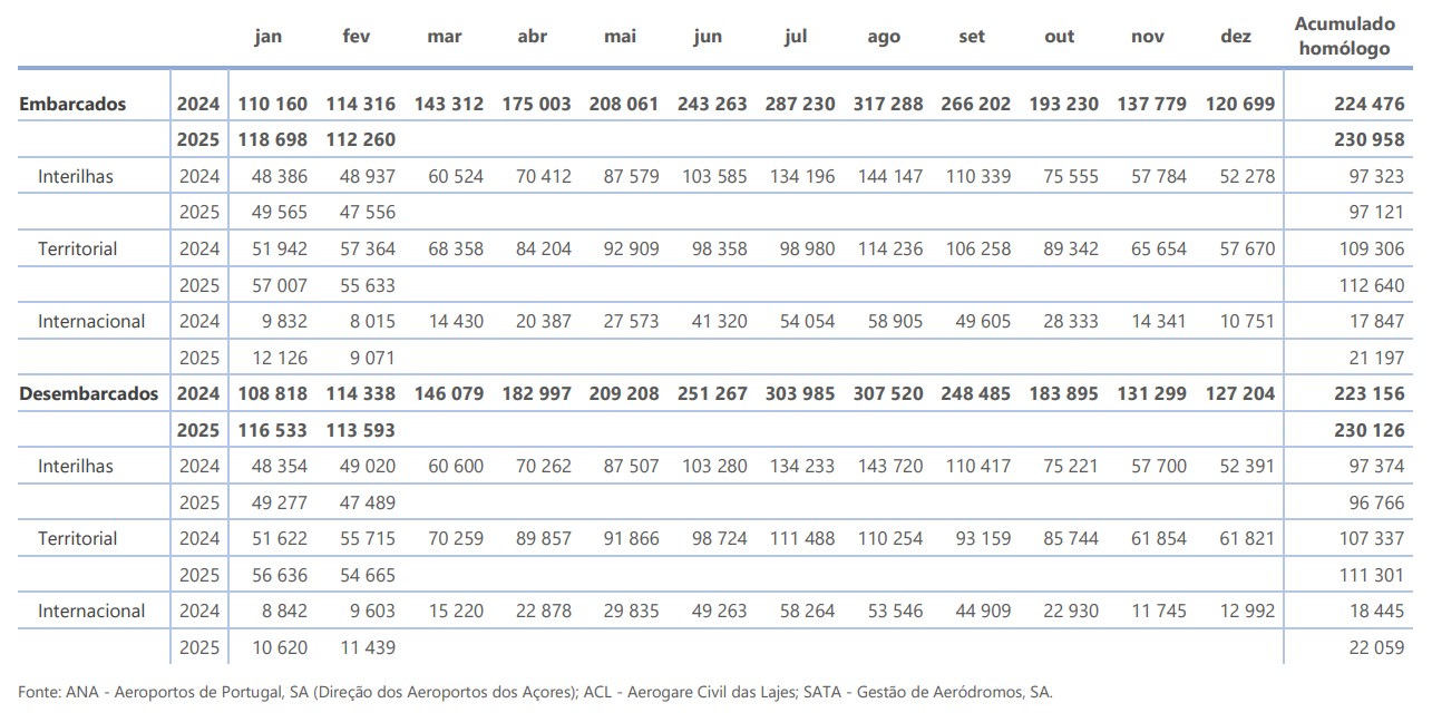 No mês de fevereiro de 2025 desembarcaram nos aeroportos dos Açores 113 593 passageiros (tvh¹ : -0,7%). Os passageiros desembarcados com origem noutras regiões do território nacional atingiram os 54 665, interilhas 47 489 e internacionais 11 439.