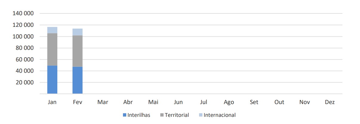 Em fevereiro de 2025 desembarcaram nos aeroportos dos Açores 113 593 passageiros, verificando-se uma variação negativa de 0,7% em relação ao mesmo mês do ano anterior.