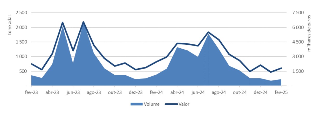No mês de fevereiro de 2025, nos Açores, foram descarregados em lota 224 138 kg de pescado (não inclui pescado rejeitado nem caldeirada, nem algas não destinadas a consumo humano) com um valor total de 1 819 235 euros, dos quais 217 280 kg foram de peixe (96,9%), correspondendo a 96,0% do valor monetário total das descargas.