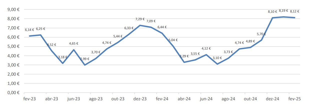 Quanto ao preço médio, neste mês aumentou 26,0% face ao mesmo mês do ano passado, para 8,12 €/kg, diminuiu 0,9% em relação ao mês anterior e desceu 0,1% na média dos últimos 12 meses.