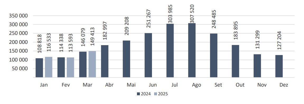 No mês de março de 2025 desembarcaram nos aeroportos dos Açores 149 413 passageiros (tvh¹: +2,3%). Os passageiros desembarcados com origem noutras regiões do território nacional atingiram os 72 986, interilhas 61 551 e internacionais 14 876.