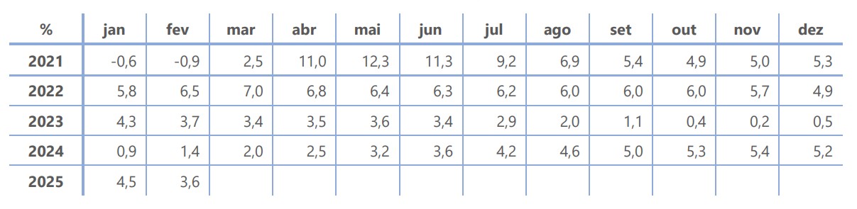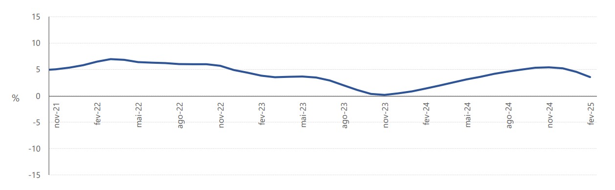 No mês de fevereiro de 2025, o Indicador do Consumo Privado para os Açores (ICP-Açores) registou, em termos homólogos, um acréscimo de 3,6%, verificando-se uma diminuição de 0,9 pontos percentuais em relação ao valor revisto do mês anterior