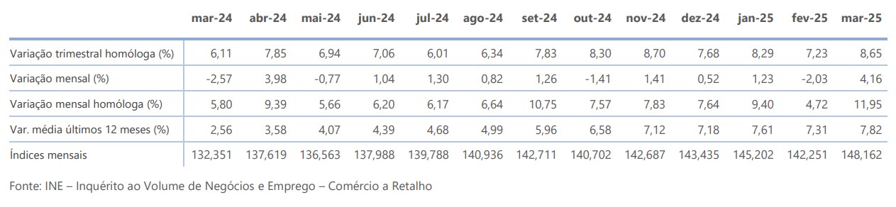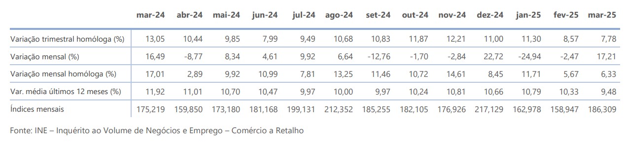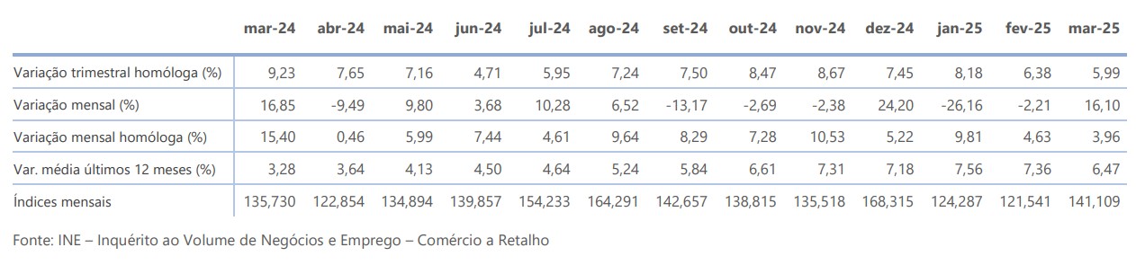O índice de vendas do comércio a retalho de produtos alimentares regista em março, a preços constantes (valores brutos, deflacionados), uma variação mensal homóloga positiva de 3,96% e uma variação trimestral homóloga igualmente positiva de 5,99%.