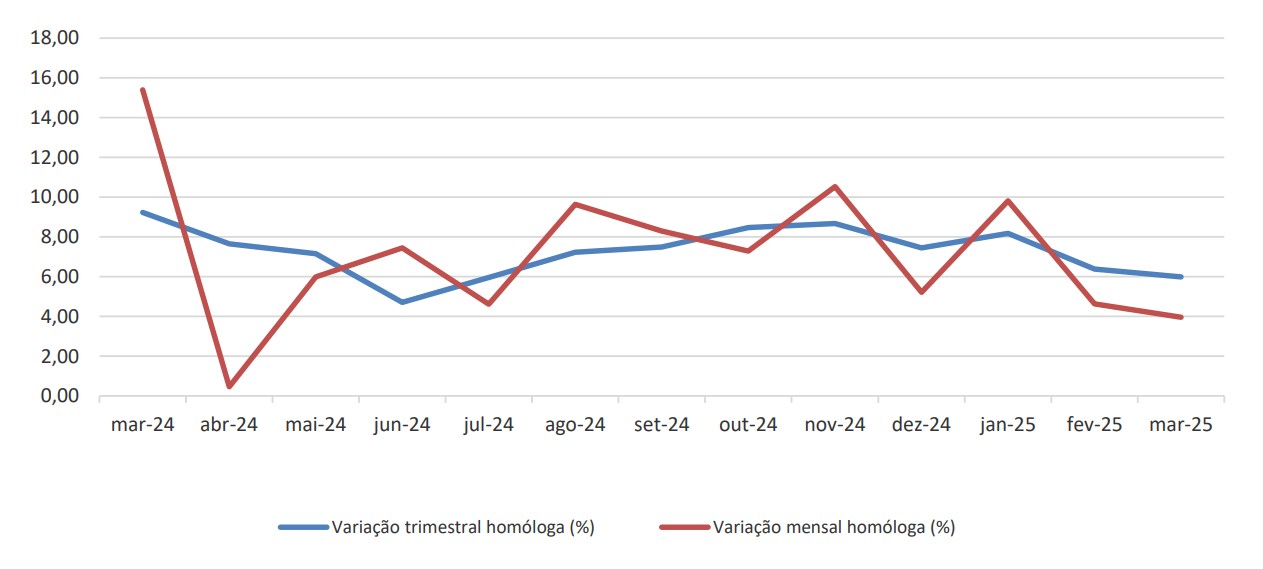 A preços constantes (corrigidos dos efeitos calendário e sazonalidade, deflacionados), verifica-se acréscimos de 7,82% relativamente à variação média nos últimos 12 meses e de 4,16% em relação à variação mensal.