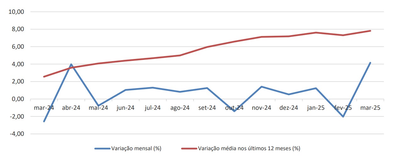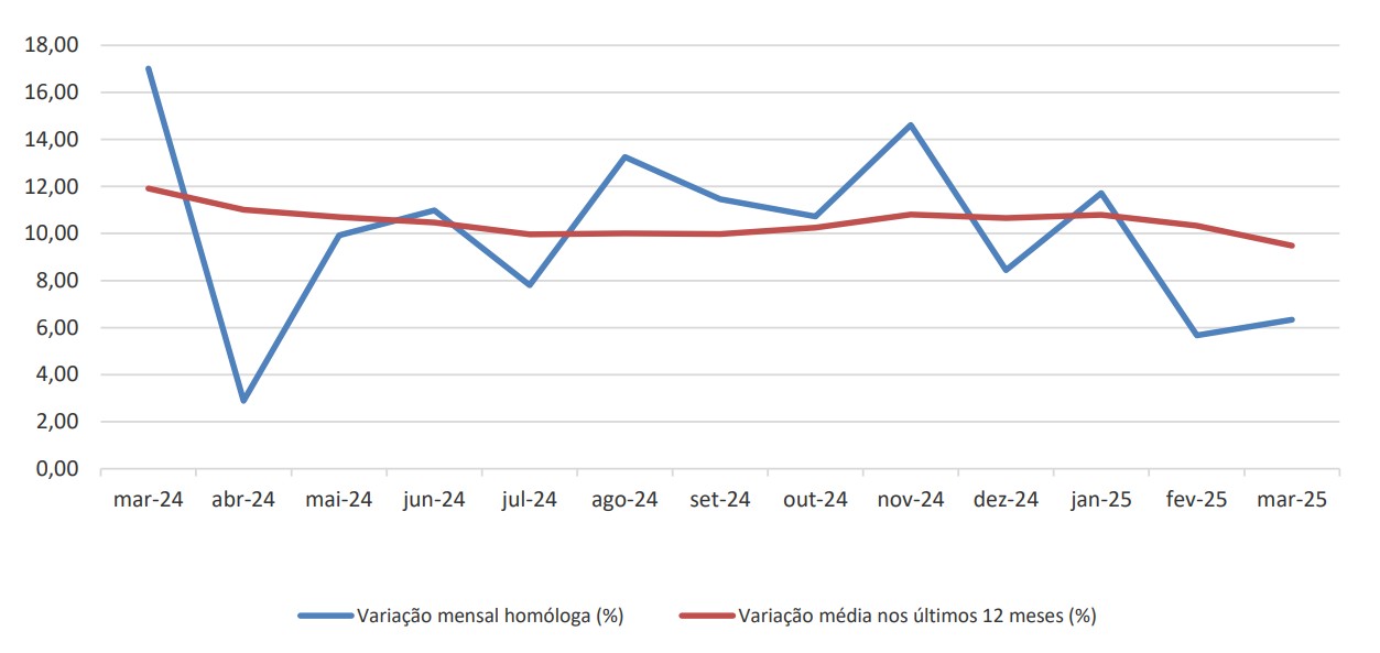 Quanto à variação mensal homóloga e média nos últimos 12 meses a preços correntes (valores brutos), a mensal homóloga situa-se nos +6,33% e a média nos últimos 12 meses nos +9,48%