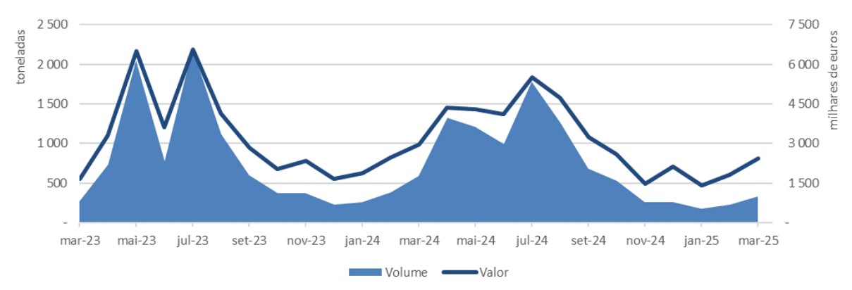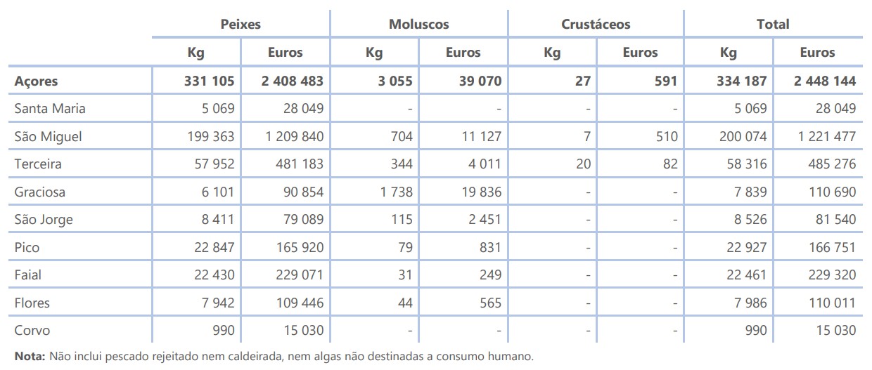 No mês de março de 2025, nos Açores, foram descarregadas em lota 334 187 kg de pescado (não inclui pescado rejeitado nem caldeirada, nem algas não destinadas a consumo humano) com um valor total de 2 448 144 euros, dos quais 331 105 kg foram de peixe (99,1%), correspondendo a 98,4% do valor monetário total das descargas.