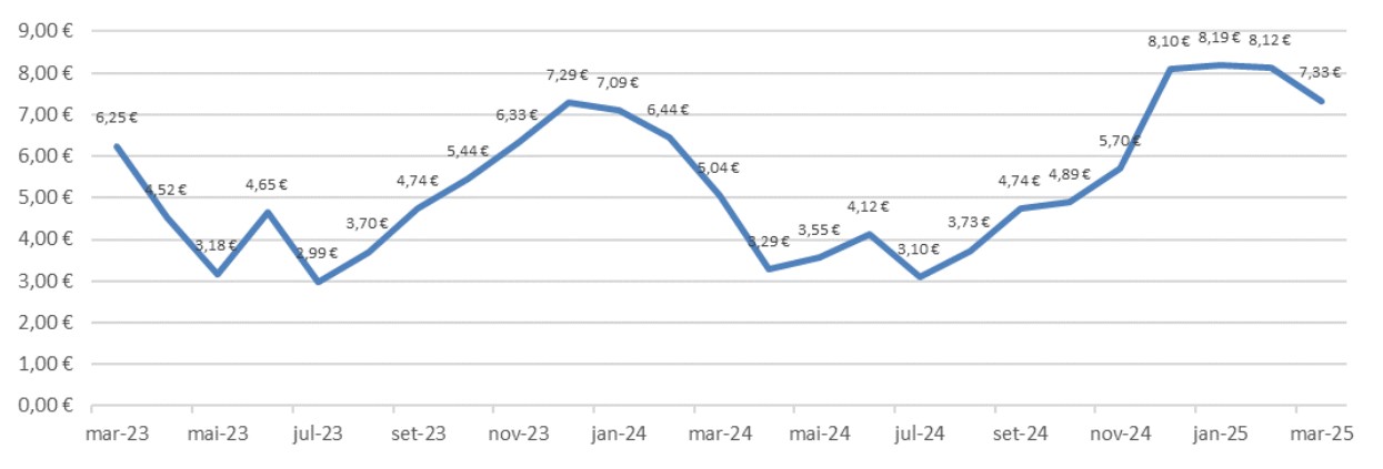 Quanto ao preço médio, neste mês aumentou 45,4% face ao mesmo mês do ano passado, para 7,33 €/kg, diminuiu 9,7% em relação ao mês anterior e aumentou 5,6% na média dos últimos 12 meses.