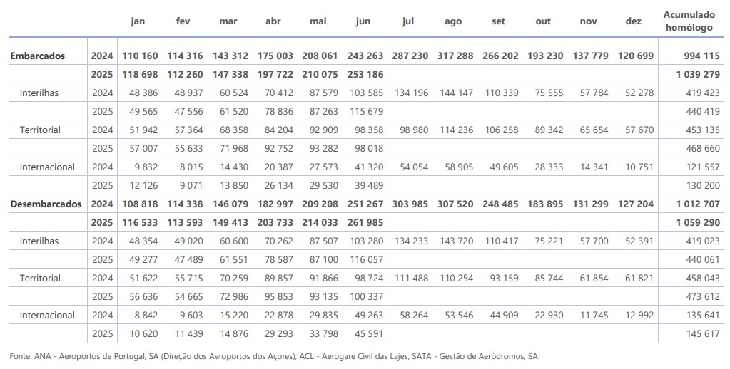 No mês de junho de 2025 desembarcaram nos aeroportos dos Açores 261 985 passageiros (tvh¹: +4,3%). Os passageiros desembarcados com origem noutras regiões do território nacional atingiram os 100 337, interilhas 116 057 e internacionais 45 591.