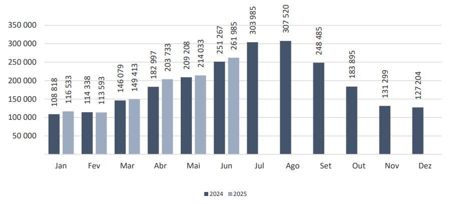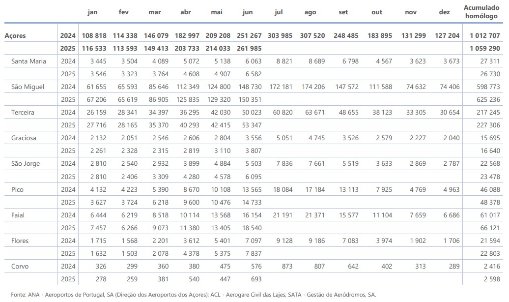 Em junho de 2025 desembarcaram nos aeroportos dos Açores 261 985 passageiros, verificando-se uma variação positiva de 4,3% em relação ao mesmo mês do ano anterior.