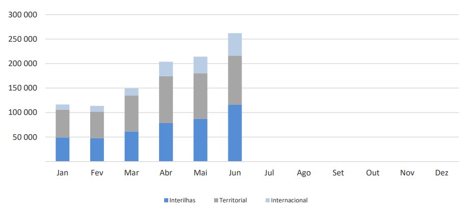 Relativamente à tipologia de voo, verificou-se apenas variação homóloga positiva de 11,7% dos passageiros embarcados nos voos interilhas, enquanto nos voos internacionais e territoriais observaram-se variações homólogas negativas de 4,4% e 0,3%, respetivamente.