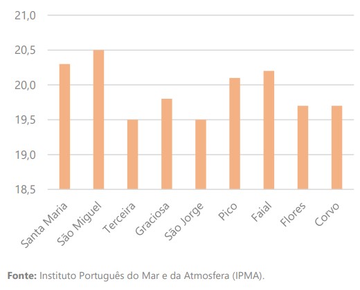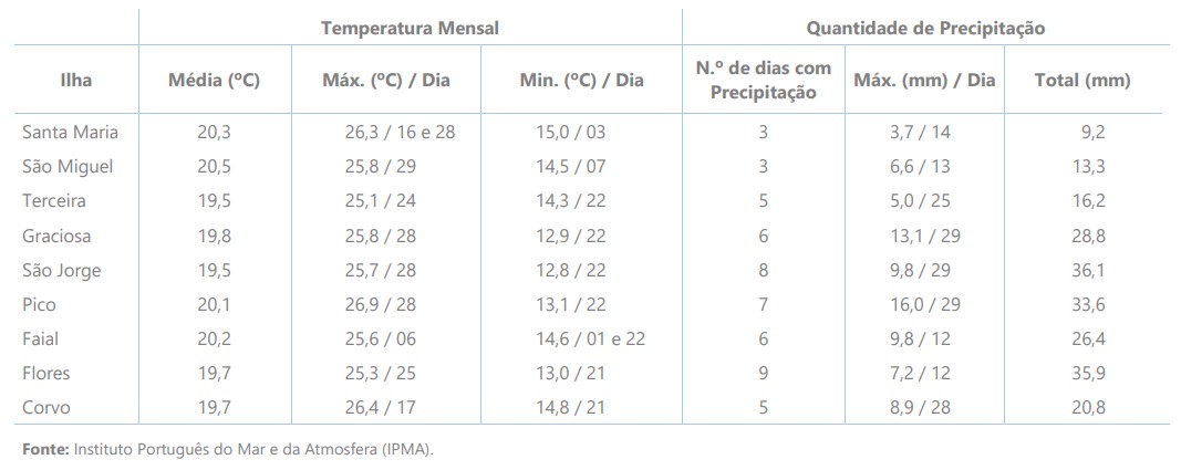 O valor da temperatura média do ar variou entre 19,5 ºC nas ilhas Terceira e São Jorge e 20,5 ºC na ilha de São Miguel. A temperatura mínima mais baixa foi 12,8 ºC, na ilha de São Jorge, e a máxima mais elevada foi 26,9ºC, na ilha do Pico.