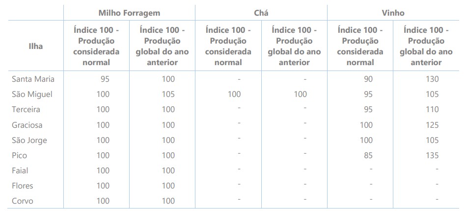 Índice 100 – Produção global do ano anterior: um valor menor, igual ou maior que 100 significa uma produção inferior, semelhante ou superior, respetivamente, à do ano anterior.