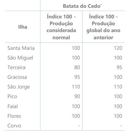 Numa primeira estimativa, obteve-se uma boa produção de batata do cedo na ilha de São Jorge. Contrariamente, nas ilhas Terceira, Pico e Graciosa, a produção ficou aquém do considerado normal, sobretudo em quantidade. Nas restantes ilhas, a produção situou-se dentro do habitual. Comparativamente ao ano anterior, espera-se que a produção global seja superior nas ilhas Santa Maria e São Jorge, e inferior na ilha Terceira. Nas outras ilhas, prevê-se uma produção semelhante à obtida no ano passado.