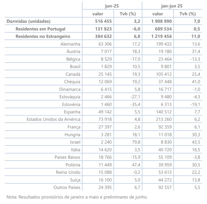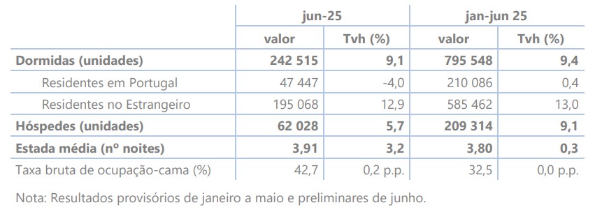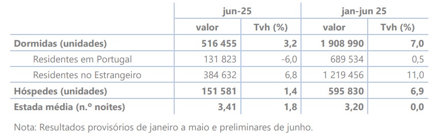 No país, em junho, as dormidas apresentaram uma variação homóloga positiva de 3,1%.