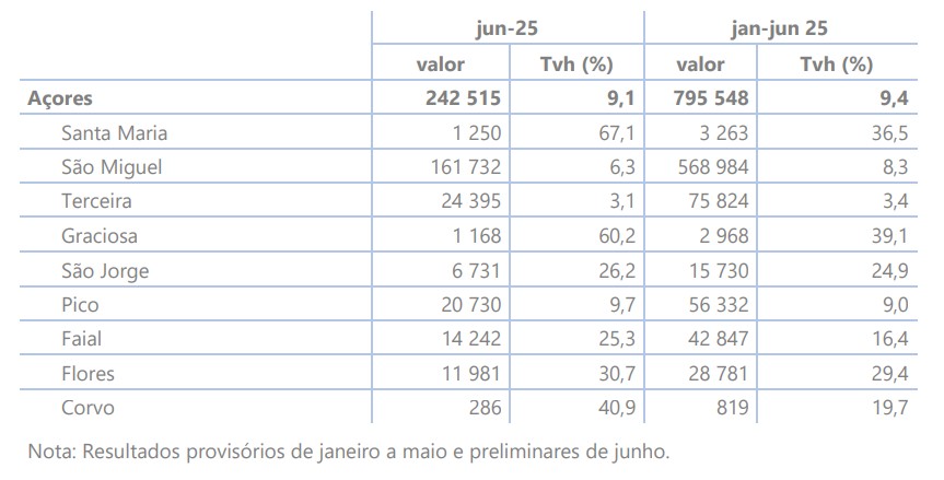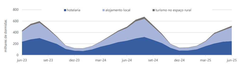 No primeiro semestre de 2025, no alojamento local, registaram-se 795,5 mil dormidas, valor superior em 9,4% ao registado no mesmo período homólogo.