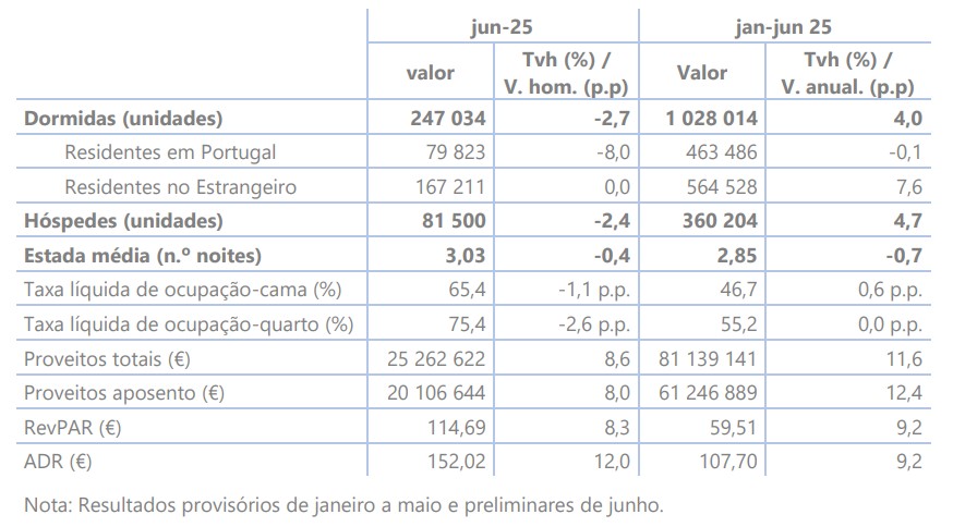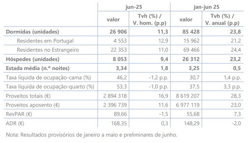 Os proveitos totais, no mês de junho, registaram uma variação homóloga positiva de 8,6%, atingindo 25,3 milhões de euros, e os proveitos de aposento tiveram uma variação positiva de 8,0%, relativamente ao mesmo mês do ano anterior, totalizando 20,1 milhões de euros. O rendimento médio por quarto disponível (RevPAR) foi de 114,69 euros e por quarto utilizado (ADR) foi de 152,02 euros.