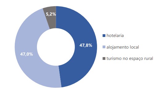 Considerando o conjunto dos estabelecimentos de alojamento turístico, a hotelaria concentrou 47,8% da totalidade de dormidas (247,0 mil dormidas), seguindo-se o alojamento local com 47,0% (242,5 mil dormidas) e o turismo no espaço rural com 5,2% (26,9 mil dormidas).