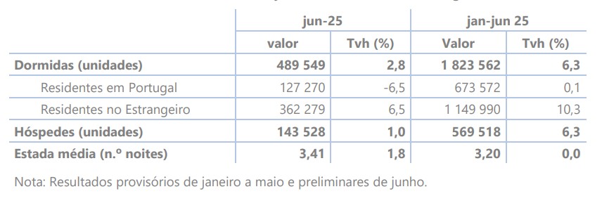 Considerando apenas os dois tipos mais representativos de estabelecimentos de alojamento turístico, hotelaria e alojamento local, com 94,8% do total de dormidas no mês de junho, registaram-se 489,5 mil dormidas, com uma variação homóloga positiva de 2,8%.
