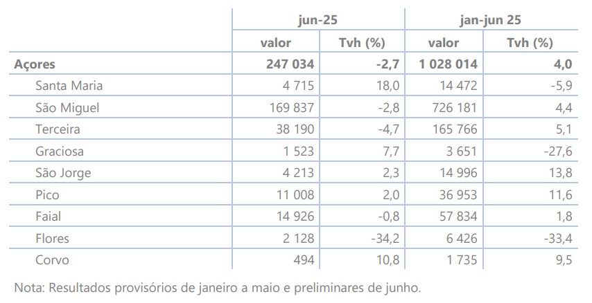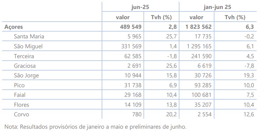 No primeiro semestre de 2025, na hotelaria, registou-se 1,0 milhão de dormidas, valor superior em 4,0% ao registado no mesmo período homólogo.