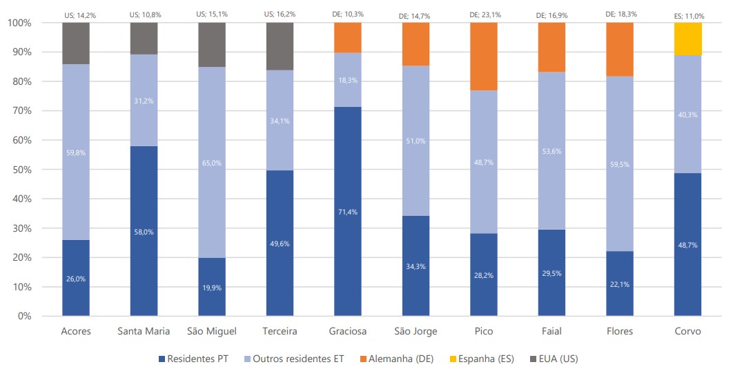 Analisando as dormidas, por mercados, na hotelaria e alojamento local, para os Açores, o mercado nacional (residentes em Portugal) garantiu 26,0% do total, enquanto os mercados externos (residentes no estrangeiro) contribuíram com 74,0%. O mercado nacional teve um maior peso nas dormidas nas ilhas Graciosa (71,4%) e Santa Maria (58,0%). Analisando os principais mercados externos, o mercado norte americano foi o principal mercado externo para os Açores (14,2%) e nas ilhas Terceira (16,2%), São Miguel (15,1%) e Santa Maria (10,8%). O mercado alemão destacou-se no Pico (23,1%), Flores (18,3%), Faial (16,9%), São Jorge (14,7%) e Graciosa (10,3%). No Corvo, o principal mercado externo foi o da Espanha (11,0%).