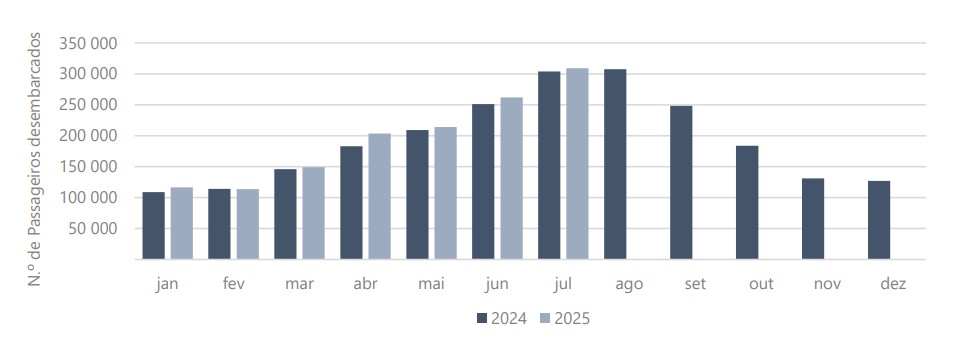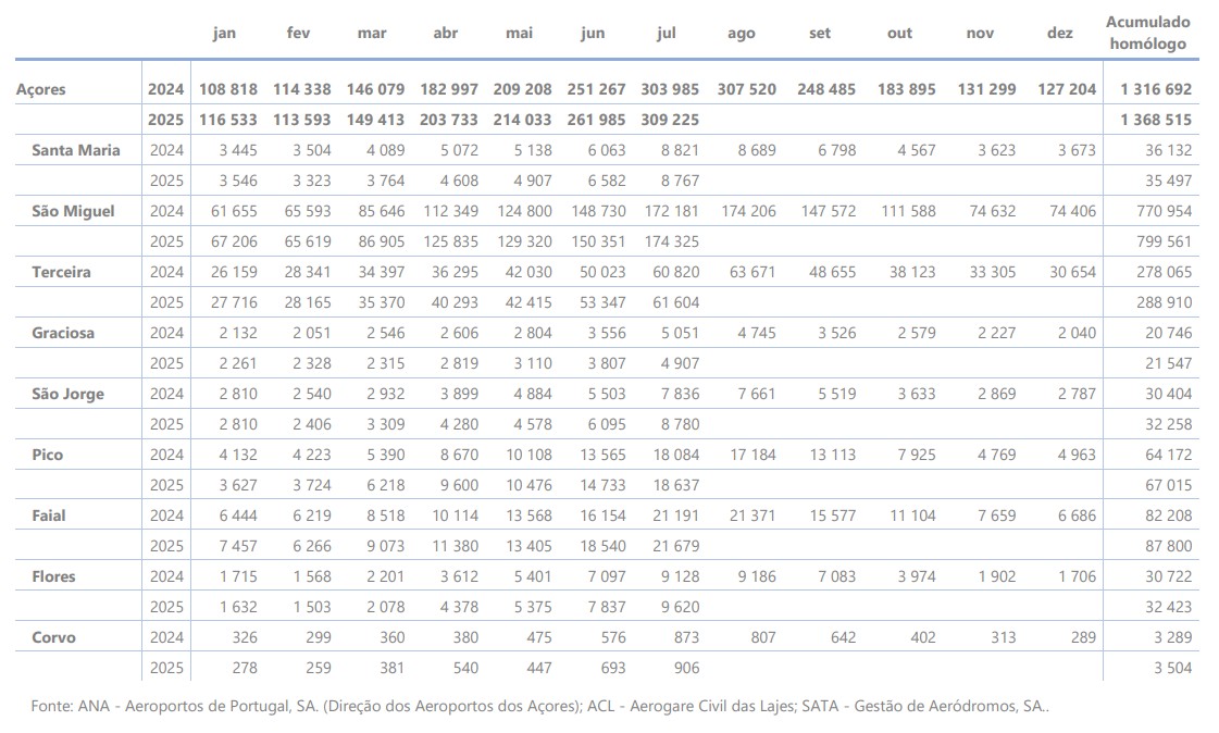 Em julho de 2025 desembarcaram nos aeroportos dos Açores 309 225 passageiros, verificando-se uma variação positiva de 1,7% em relação ao mesmo mês do ano anterior.
