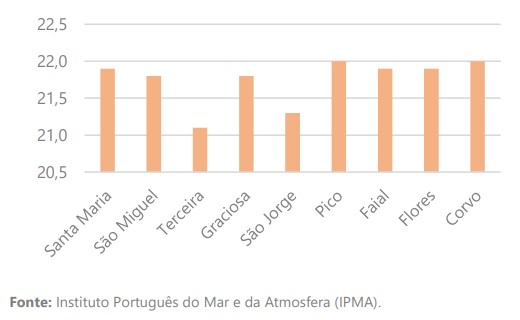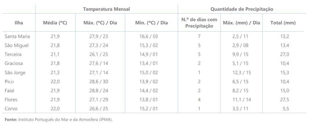 O valor da temperatura média do ar variou entre 21,1 ºC na ilha Terceira, e 22,0 ºC nas ilhas Pico e Corvo; a temperatura mínima mais baixa foi 13,4 ºC, na ilha Graciosa, e a máxima mais elevada foi 28,8 ºC, na ilha do Faial.