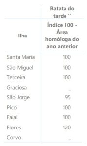 A área plantada com batata do tarde, na maioria das ilhas, manteve-se idêntica à do ano anterior, apenas se registando algum aumento na ilha das Flores e uma ligeira diminuição na ilha de São Jorge. Em algumas ilhas, a falta de precipitação e a subida da temperatura afetaram negativamente o desenvolvimento das plantas já nascidas. Também se verificou o aparecimento de doenças fúngicas, devido à humidade elevada.