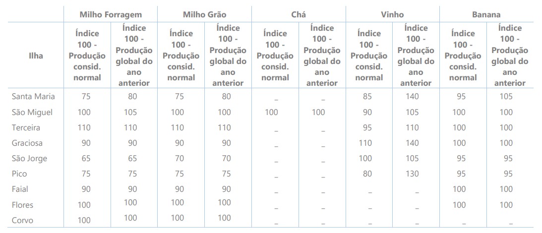 Índice 100 – Produção global do ano anterior: um valor menor, igual ou maior que 100 significa uma produção inferior, semelhante ou superior, respetivamente, à do ano anterior.