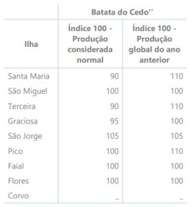 Obteve-se uma boa produção de batata do cedo na ilha de São Jorge, tanto em quantidade como em qualidade. Contrariamente, nas ilhas Santa Maria, Terceira e Graciosa, a produção ficou aquém do considerado normal, sobretudo em quantidade. Nas restantes ilhas, a produção situou-se dentro do habitual. Comparativamente ao ano anterior, espera-se que a produção global seja superior nas ilhas Santa Maria, Terceira, Pico e São Jorge. Nas outras ilhas, prevê-se uma produção semelhante à obtida no ano passado.