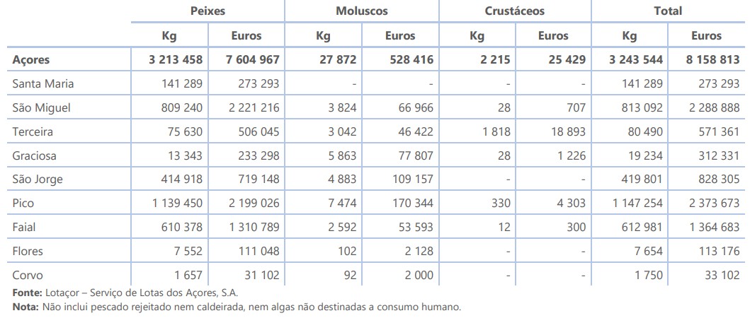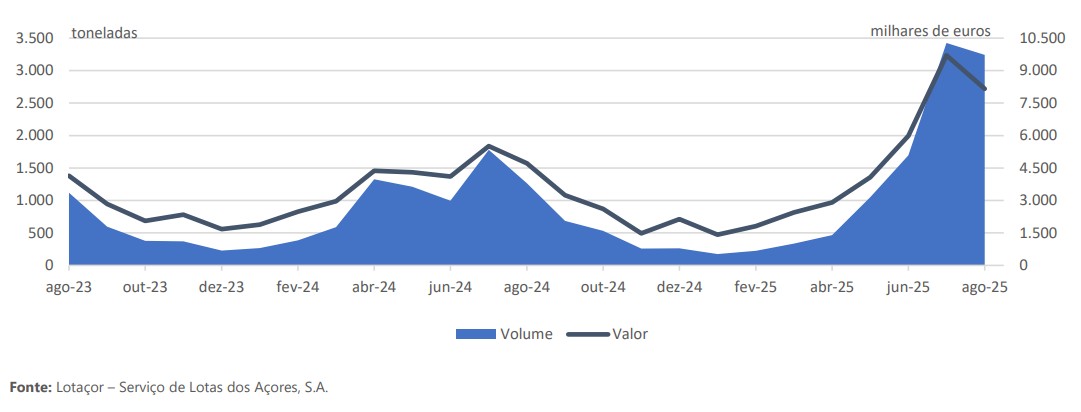 No mês de agosto de 2025, nos Açores, foram descarregadas em lota 3 243,5 toneladas de pescado (não inclui pescado rejeitado nem caldeirada, nem algas não destinadas a consumo humano) com um valor total de 8,2 milhões de euros.