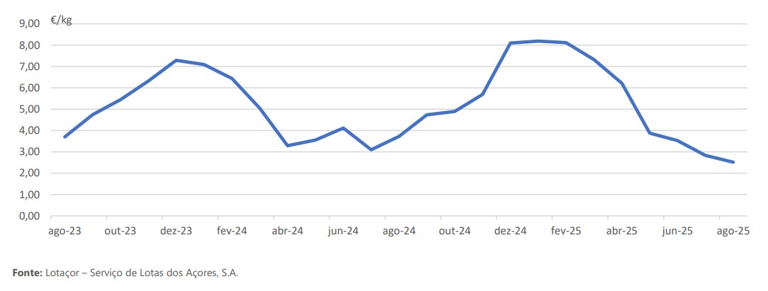 Nos Açores, o preço médio do pescado descarregado, em agosto, diminuiu 32,5% face ao mesmo mês do ano anterior, para 2,52 €/kg, e diminuiu 11,2% em relação ao mês anterior.