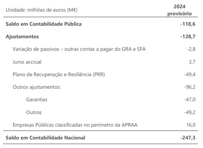 O Quadro 1 sintetiza, para 2024 (dados provisórios), os principais ajustamentos da passagem do saldo da APRAA em Contabilidade Pública para o saldo em Contabilidade Nacional. O saldo da APRAA em Contabilidade Nacional, em 2024, foi deficitário em 247,3 milhões de euros (valor provisório), resultante do saldo negativo da Contabilidade Pública (-118,6 M€) e do conjunto dos ajustamentos (-128,7 M€).