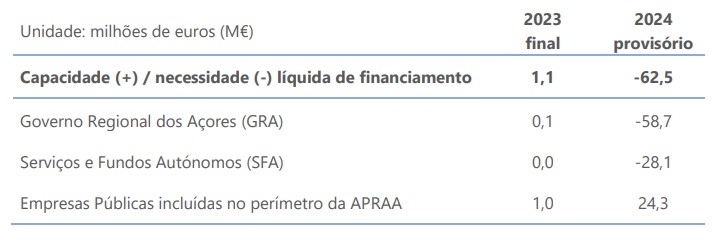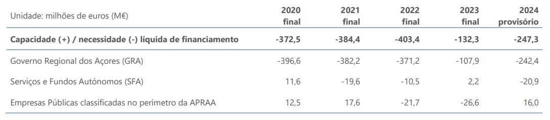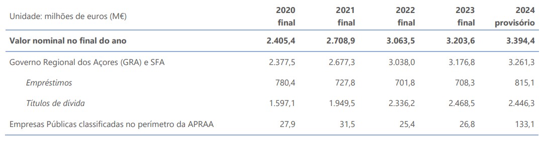 Em 2024 a necessidade de financiamento da Administração Pública da Região Autónoma dos Açores foi de 247,3 milhões de euros (M€), tendo a dívida bruta (consolidada) atingido os 3.394,4 M€.