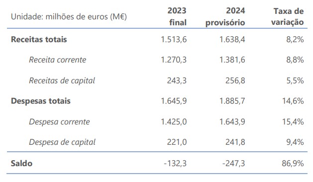 Na Região Autónoma da Madeira, o saldo da Administração Pública Regional em 2024 foi excedentário em 169,5 M€, enquanto a dívida bruta da Administração Pública Regional situou-se em 4,9 mil milhões de euros no final desse ano.