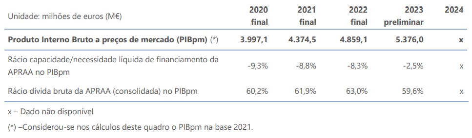 No último ano (2023) em que existe informação disponível (valor preliminar) do Produto Interno Bruto a preços de mercado (PIBpm), o rácio da capacidade/necessidade de financiamento face ao PIBpm foi de -2,5% e o peso da dívida bruta da APRAA (consolidada) no PIBpm situou-se em 59,6% (Quadro 5).