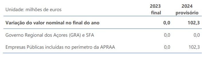A dívida bruta da Administração Pública Regional dos Açores teve uma revisão em 2024, comparativamente à anterior notificação, de 102,3 milhões de euros. Esta revisão resulta da incorporação da dívida da SATA Air Açores, S.A. e da SATA Gestão de Aeródromos, S.A., decorrente da reclassificação destas empresas no perímetro das Empresas Públicas da APRAA, a partir de 2024.