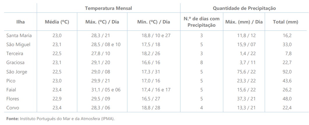 Durante o mês de agosto, em todas as ilhas, verificaram-se temperaturas médias do ar relativamente elevadas e precipitação baixa e pouco frequente. No entanto, na ilha de São Jorge, foi registado um evento de precipitação forte causado pela passagem de um vale frontal, num período inferior a 24 horas, registando-se uma precipitação de 75,6 mm num só dia.