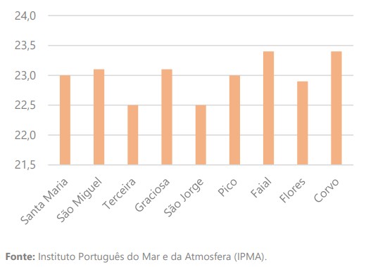 O valor da temperatura média do ar variou entre 22,5 ºC nas ilhas Terceira e São Jorge, e 23,4 ºC nas ilhas Faial e Corvo; a temperatura mínima mais baixa foi 16,5 ºC, na ilha das Flores, e a máxima mais elevada foi 31,1ºC, na ilha do Faial.