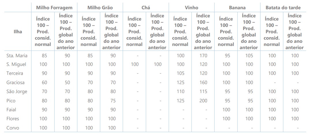 Índice 100 – Produção global do ano anterior: um valor menor, igual ou maior que 100 significa uma produção inferior, semelhante ou superior, respetivamente, à do ano anterior.