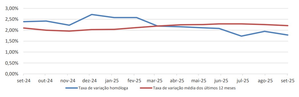A taxa de variação homóloga do IPC, “Total”, de setembro, situou-se nos 1,78%, diminuindo 0,17 pontos percentuais em relação ao mês de anterior.