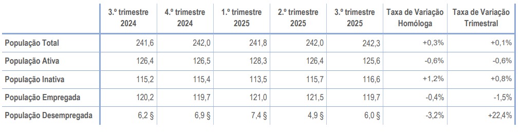A população empregada (119,7 milhares de indivíduos) diminuiu 0,4% face ao trimestre homólogo e 1,5% relativamente ao 2.º trimestre de 2025. A população desempregada (6,0 milhares de indivíduos) diminuiu em relação ao trimestre homólogo (-3,2%) e aumentou face ao trimestre anterior (+22,4%).