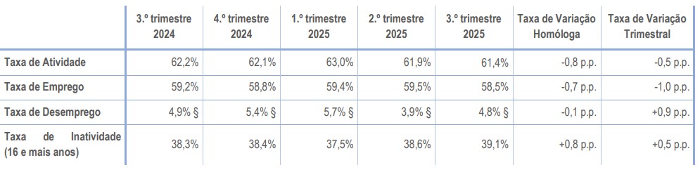 No terceiro trimestre de 2025 a taxa de atividade fixou-se em 61,4%, menos 0,8 pontos percentuais (p.p.) face ao trimestre homólogo e menos 0,5 p.p. relativamente ao 2.º trimestre de 2025.