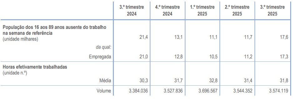 No terceiro trimestre de 2025 estiveram ausentes do trabalho na semana de referência 17,6 milhares de indivíduos dos 16 aos 89 anos. Neste trimestre, o número de horas efetivamente trabalhadas foi cerca de 3,6 milhões.