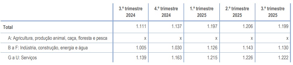 O setor dos Serviços foi o que apresentou o rendimento salarial médio mensal líquido dos trabalhadores por conta de outrem mais elevado (1.222 euros), apresentando uma variação homóloga de +7,3%.