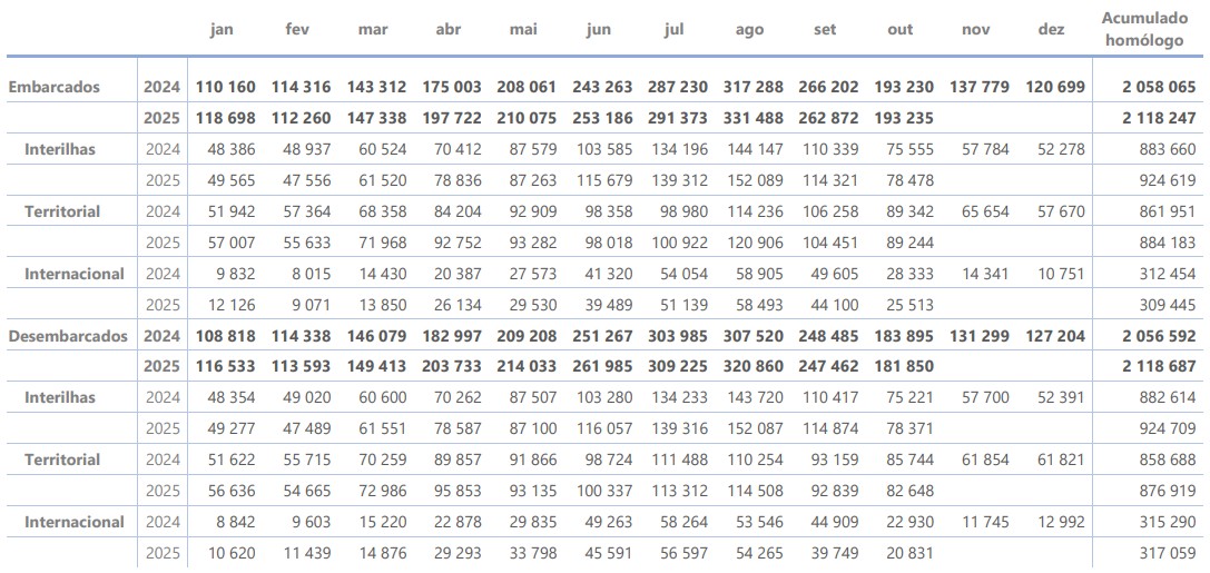 Em outubro de 2025 desembarcaram nos aeroportos dos Açores 181 850 passageiros, verificando-se uma variação negativa de 1,1% em relação ao mesmo mês do ano anterior.