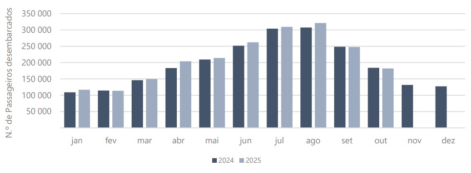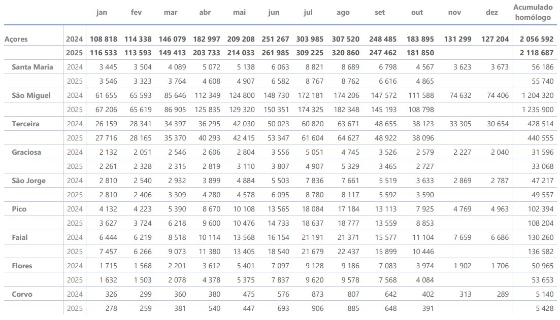 No mês de outubro de 2025 desembarcaram 181 850 passageiros nos aeroportos dos Açores, verificando-se um decréscimo homólogo de 1,1%. Nos voos territoriais desembarcaram 82 648 passageiros (decréscimo homólogo de 3,6%), nos voos interilhas 78 371 passageiros (acréscimo homólogo de 4,2%) e nos voos internacionais 20 831 passageiros (decréscimo homólogo de 9,2%).