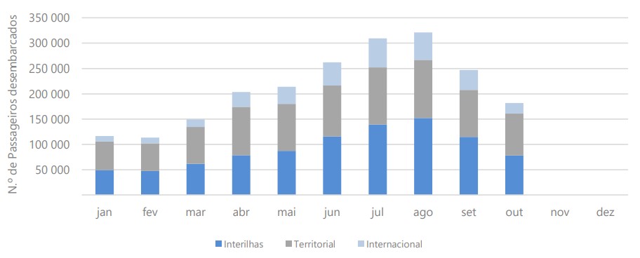 Nos aeroportos dos Açores, em outubro, os passageiros desembarcados verificaram-se com maior intensidade em voos territoriais (45,4% do total de passageiros desembarcados), seguindo-se os desembarcados em voos interilhas (43,1%) e os desembarcados em voos internacionais (11,5%).