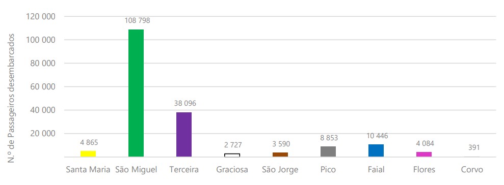 Neste mês, a ilha de São Miguel, com 108 798 passageiros desembarcados, concentrou 44,0% do total de passageiros desembarcados nos aeroportos dos Açores, seguindo-se as ilhas Terceira, com 38 096 (15,4% do total), Faial, com 10 446 (4,2% do total), e Pico, com 8 853 (3,6% do total).